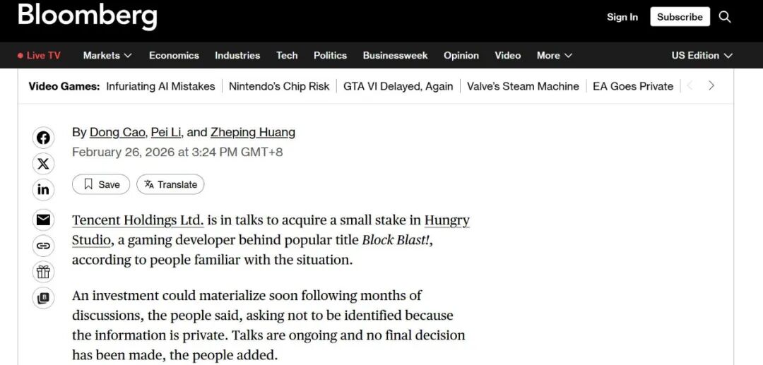 彭博社 2 月 26 日报道,腾讯目前正计划收购休闲厂商 Hungry Studio 旗下的少数股份。据内部人士透露,腾讯可能会在接下来几个月中确定投资细节,但目前还没有做出最后决定。