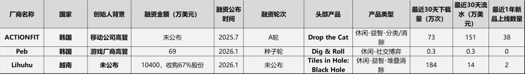 相比之下,虽然韩国和越南游戏市场公开的融资消息不多,但其中依然不乏休闲小团队的身影。比如在 2026 年 1 月宣布完成 69 万美元种子轮融资的韩国休闲厂商 Peb,该公司的创始人来自以做猫咪主题休闲游戏著称的 TREEPLLA。第一款产品也走休闲路线,是一款以“钻地”为主题的社交博弈游戏「Dig & Roll」,目前处于最终测试阶段,发行商也正是 TREEPLLA。