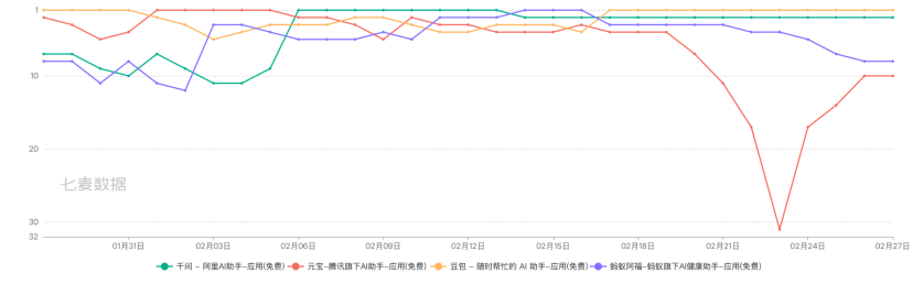 春节期间主流 AI 应用的 AppStore 免费榜排名。图源:七麦数据