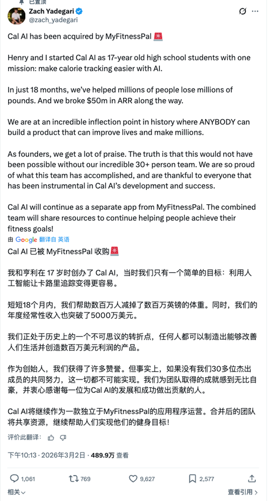 CalAI,这个由高中生 Zach Yadegari 发起的创业项目也迎来阶段性的结局,收购后,产品仍将独立运营,Zach Yadegari 在内 7 名成员均将加入 MyFitnessPal。(可参见我们的置顶文章《17 岁高中生做 AI App,不到 4 个月入账百万美元,独立开发者迎来春天?》)