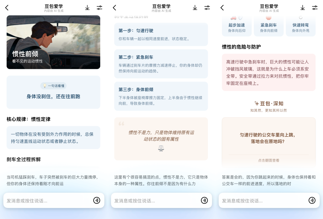 比如关于「急刹车时身体为什么前倾」这个问题,物理老师两个字就能答完:惯性。豆包爱学没有这么做,它先把过程还原给学生看——刹车前,车和人都在匀速运动;刹车时,车速骤降,身体由于惯性保持原速;车速和身体之间的速度差值,便导致了「前倾」。学生自然而然就理解了书上那句抽象的概念:「惯性是状态,而不是一种力」。