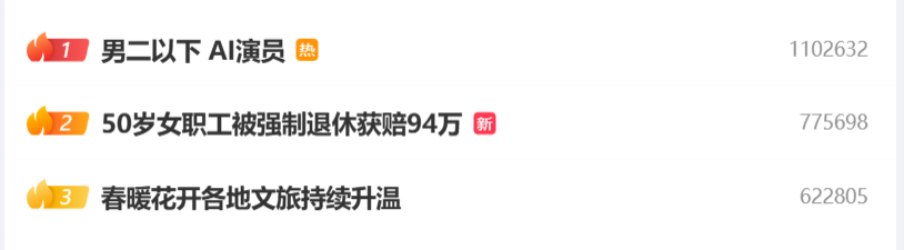 近日,“男二以下 AI 演员”话题冲上微博热搜第一,阅读量瞬间破亿。