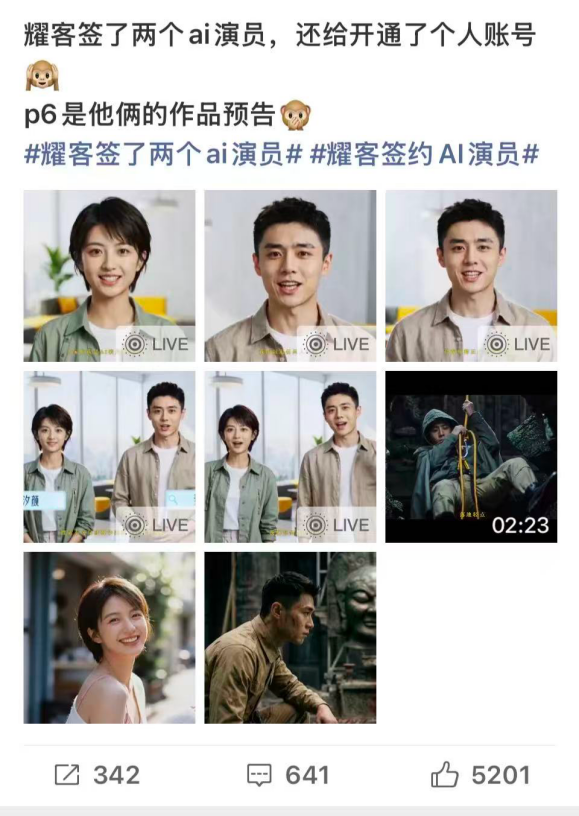 尽管事后多家短剧制作公司回应称“目前还做不到,AI 演员和真人演员没法在同一图层”,耀客传媒却在高调官宣签约两位AI数字艺人。