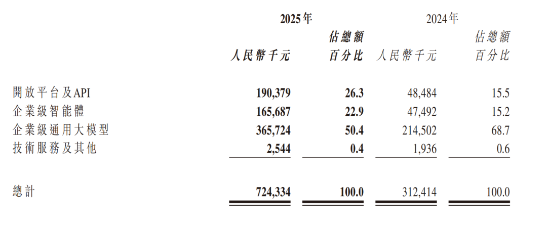 智谱的收入结构在过去一年内,发生了剧烈的变化。此次财报,在本地化部署和云部署的基础之上,智谱首次进一步将业务划分为了企业级通用大模型、开放平台及 API、企业级智能体和核心服务及其他。