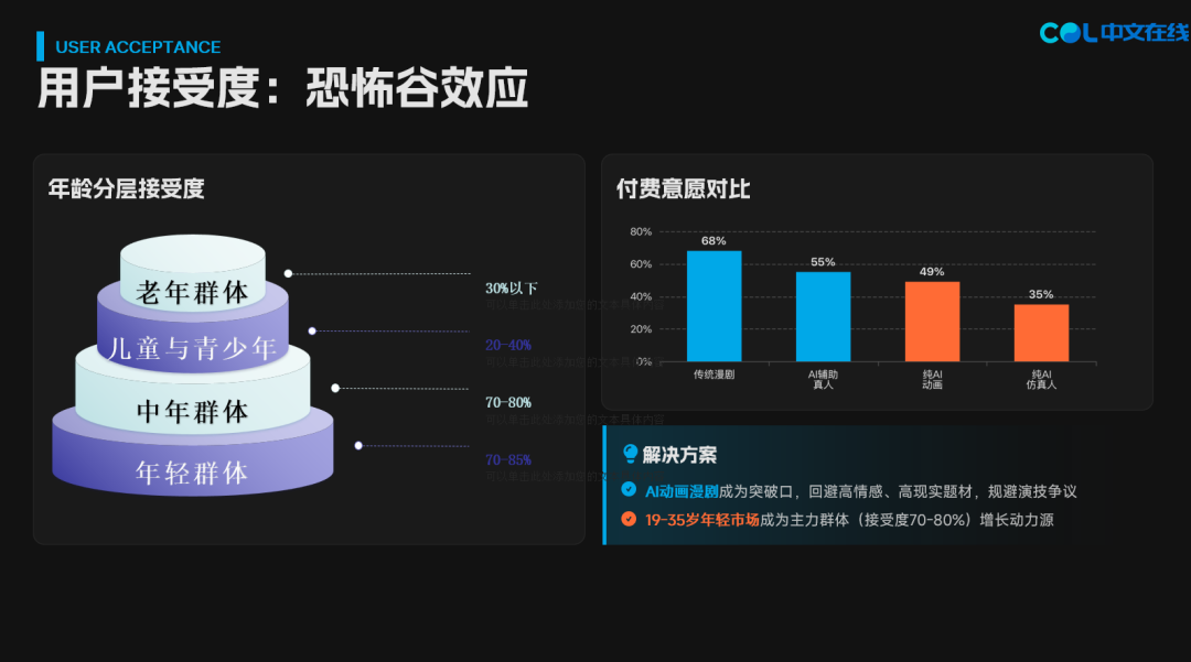 不过值得一提的是,狂飙的播放量并不完全等同于用户满意度,用户对于 AI 真人剧的接受度其实并不高。不少用户表示,中文在线的一份行业统计显示,对于 AI 短剧用户接受度为:恐怖谷效应。现阶段,在传统漫剧、AI辅助真人、纯 AI 动画、纯 AI 仿真人几种内容分类里,用户对于 AI 仿真人剧付费意愿最低。