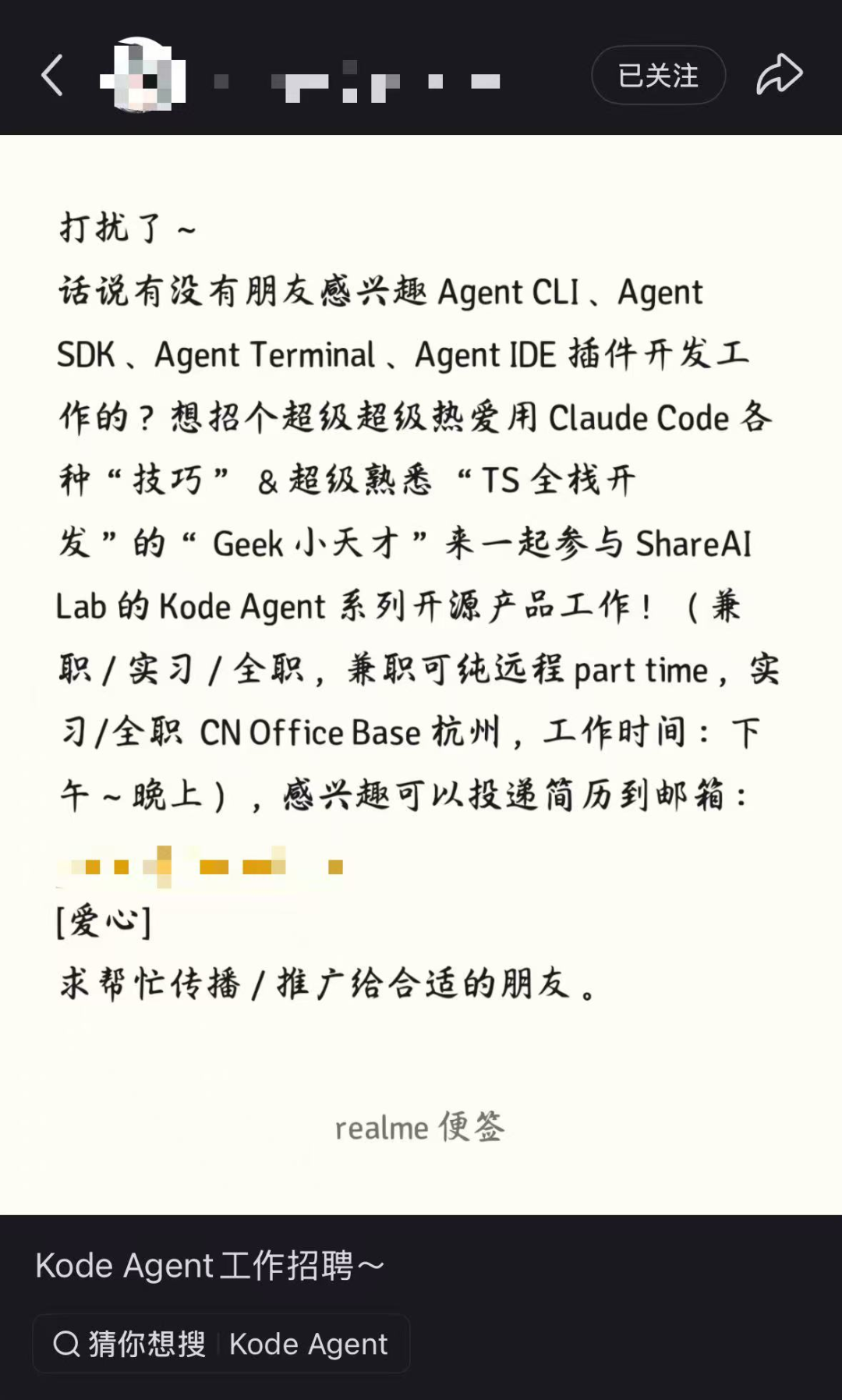 同其他招聘信息不同的是,这位创业者展示的招聘界面看上去非常“简陋”,一张招聘图片和几段文字。例如一则招聘 Agent 开发的招聘启事,看上去无比简单,互动量并不高,可实际上大部分互动都是通过私信完成。
