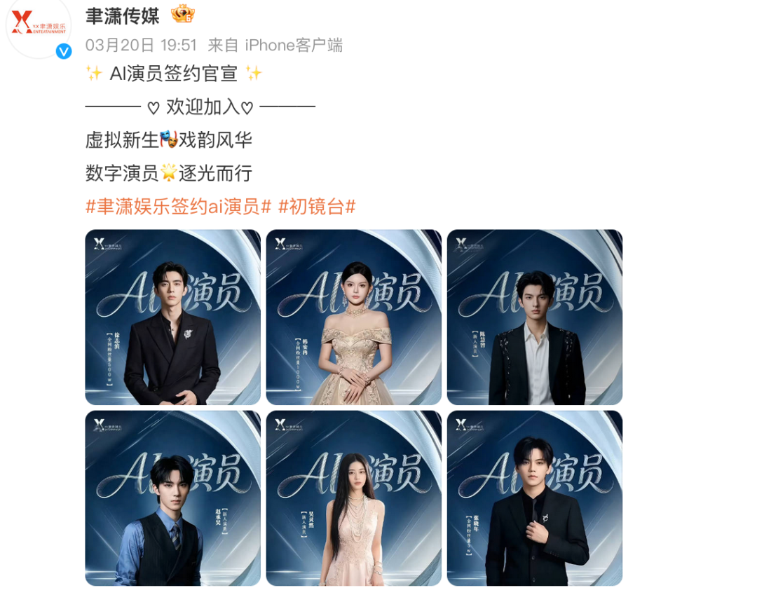 3月20日,聿潇传媒官宣签约六名 AI 演员,名单中既有新人演员,也包括千万粉丝级网红韩安冉和徐志滨。与过去 AI 换脸、AI 合成带来的侵权争议不同,聿潇传媒明确表示“签约均为真人建模,绝对尊重肖像版权”,将 AI 演员的探索推向了合法合规的新阶段。