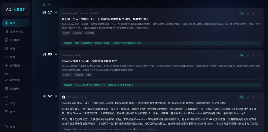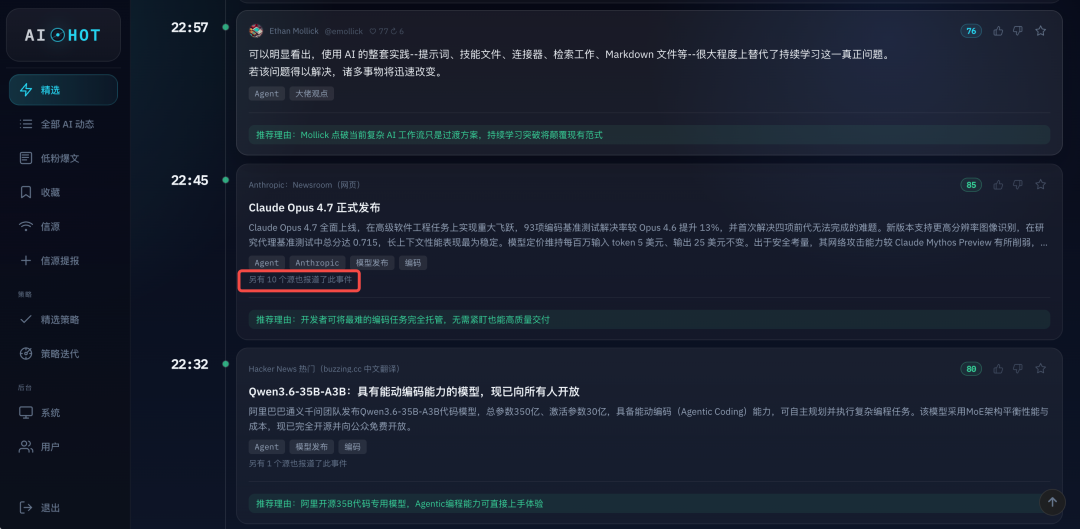 这玩意火到什么程度呢,我自己开发的给公司内部用的全网 AI 信息监控的产品 AIHOT 上,监控了精挑细选的几十个有价值的信源,一般一个信息,有 3 个信源同时报道,就已经比较受关注了。