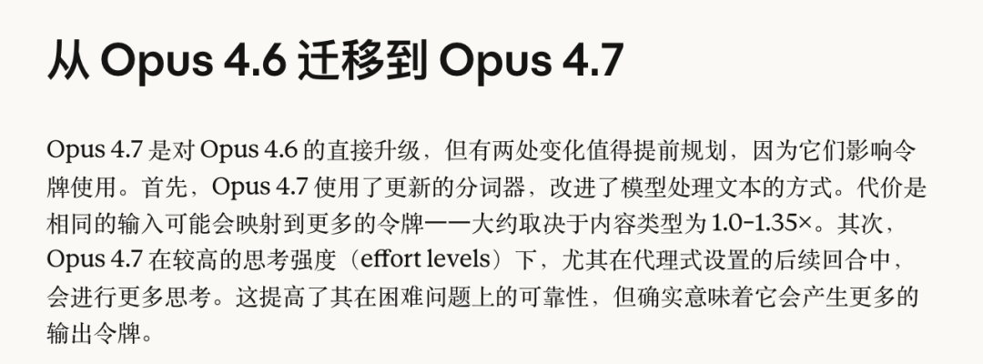 意思就是,你把同一段代码、同一份文档、同一个 prompt 丢给 4.7 和 4.6,4.7 要多吃最多 35%的 token。