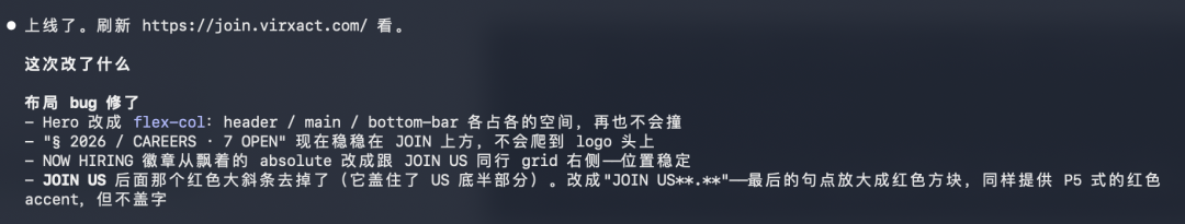 而这次,可能得益于多模态能力的提升,我用 Claude Opus 4.7,顺手做了一下我之前要做但是还没来得及做的公司招聘网站,效果出奇的好。