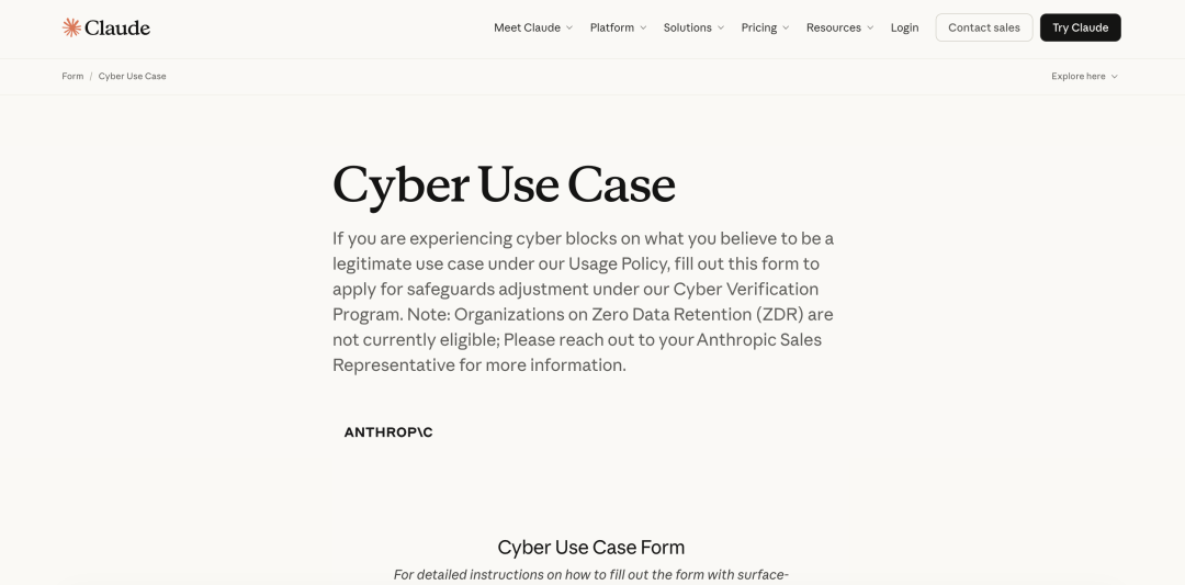 申请入口是 claude.com/form/cyber-use-case