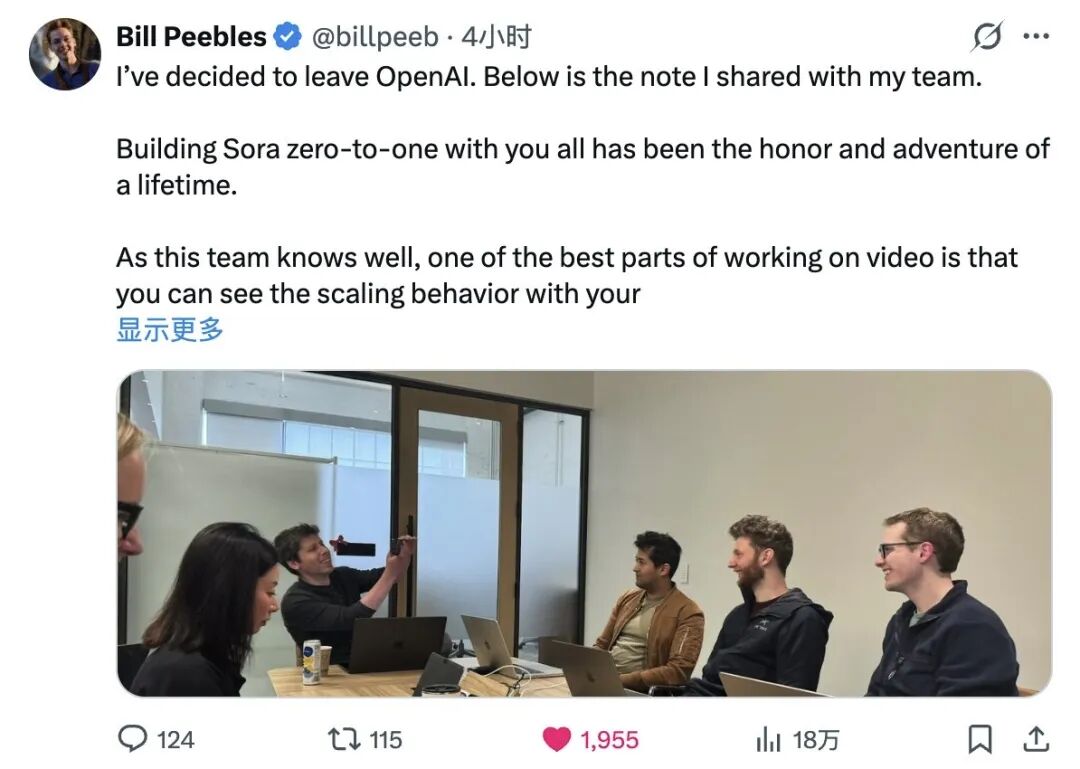 在他递交辞呈前,Sora 另一位核心负责人蒂姆・布鲁克斯(Tim Brooks)早已率先离职,加盟 Google DeepMind;负责视频理解算法的多名 VP 级高管,也纷纷在 LinkedIn 更新离职状态。