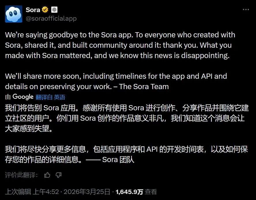 直至 3 月 25 日,OpenAI 官宣关停 Sora API 内测计划,全面转向纯企业级定制服务。