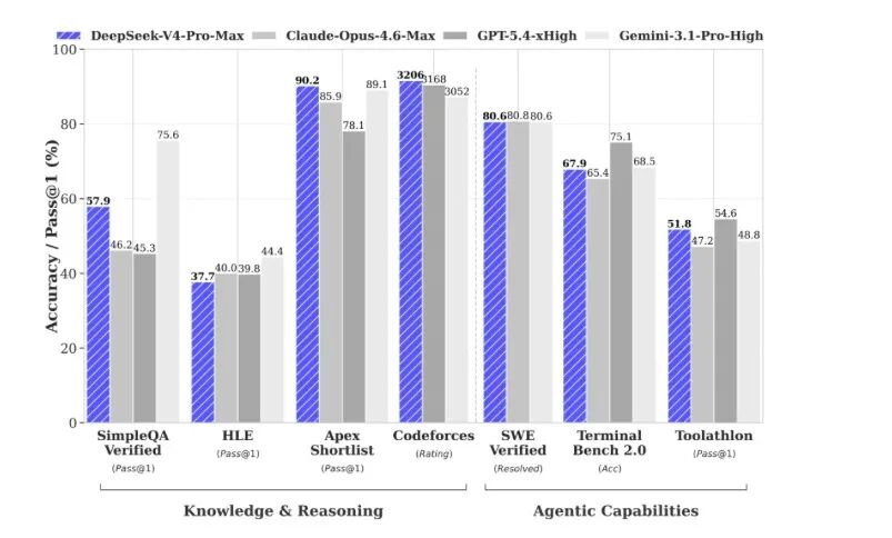 二是,在世界知识测评中, DeepSeek-V4-Pro 世界知识储备大幅领先全部开源模型,仅略逊于 顶尖闭源模型 Gemini-Pro-3.1。