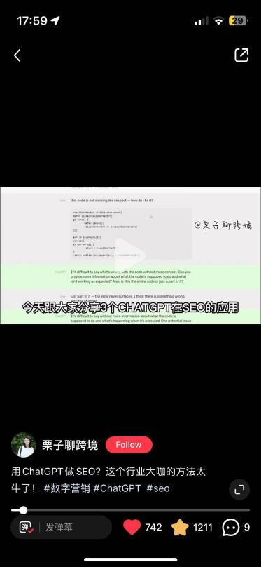 目前在小红书上,如果搜索 ChatGPT+SEO 的关键词,不会有人表达自己对类 ChatGPT 产品的出现可能威胁到自己工作的担忧,大家都在发笔记分享 ChatGPT 做 SEO 的经验。有一条标题为“用 ChatGPT 做 SEO?这个行业大咖的方法太牛了!”的视频笔记已经获得了 700+ 的喜欢和 1000+ 的收藏。在这条视频中,博主表示做海外 SEO,最痛苦的莫过于海外内容的生产,全球这么多语言,怎么布局关键词、怎么生成高质量内容,想想就让人头秃。而现在,这些工作都可以借助 ChatGPT 来完成了。