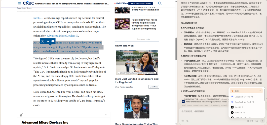 例如在一篇商业报道浏览中,将 AMD 近期股价大涨的信息划出并要求 Tabbit 分析原因。Tabbit 迅速调用AI能力分析相关报道并给出答案: