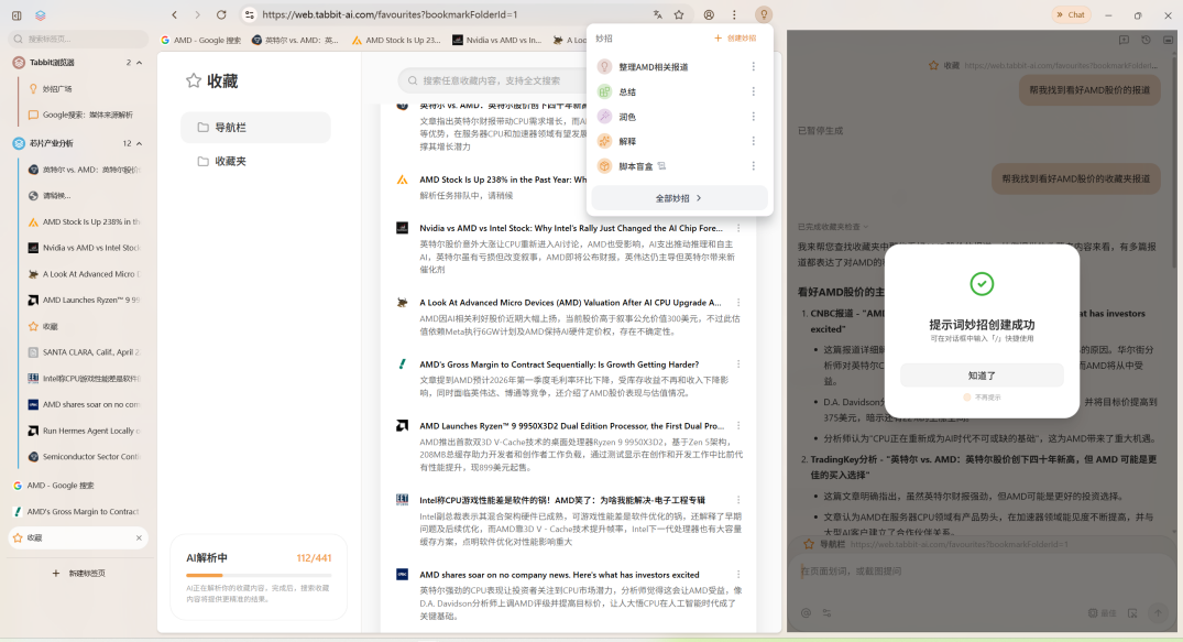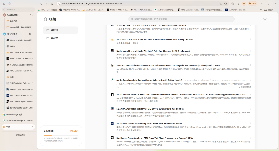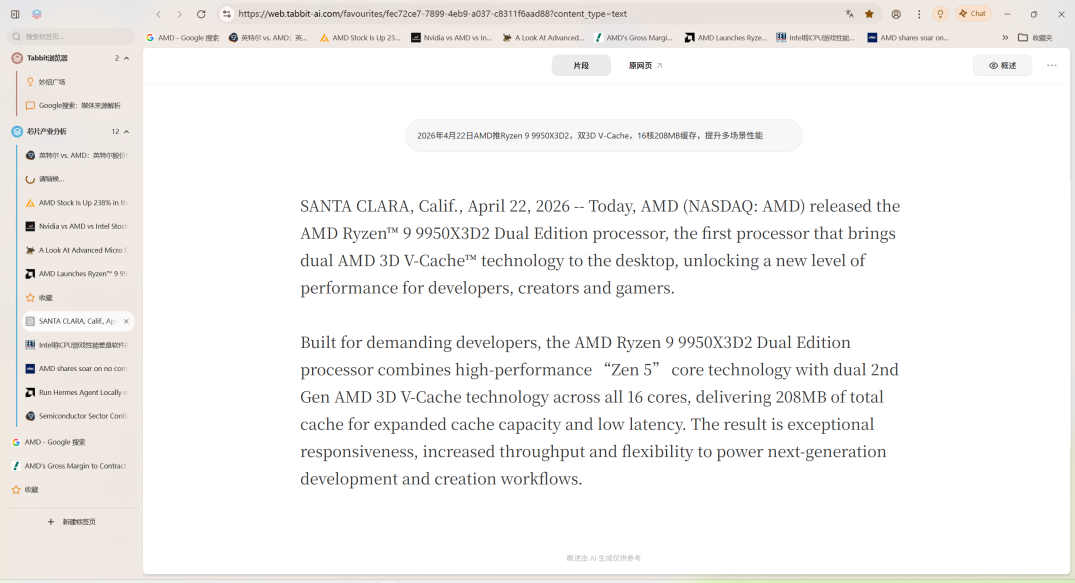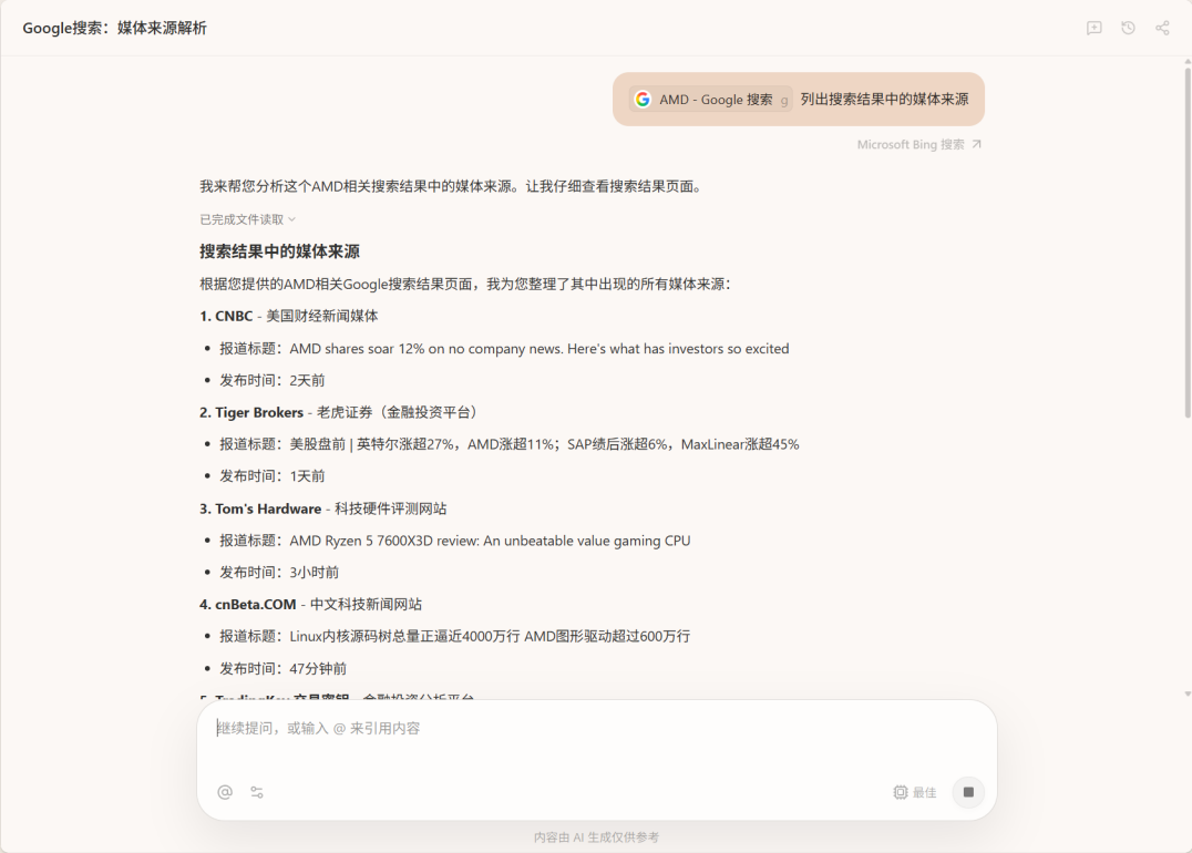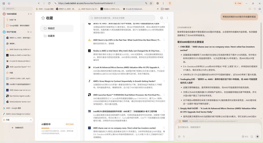更重要的是,Tabbit 支持直接与 AI 对话,总结梳理整个标签组的相关内容。如针对“芯片产业分析”这组标签组,对话 AI 要求分析媒体判断,立即就能获得“该组媒体对 AMD 前景一致乐观”的结果,并附带详细分析。