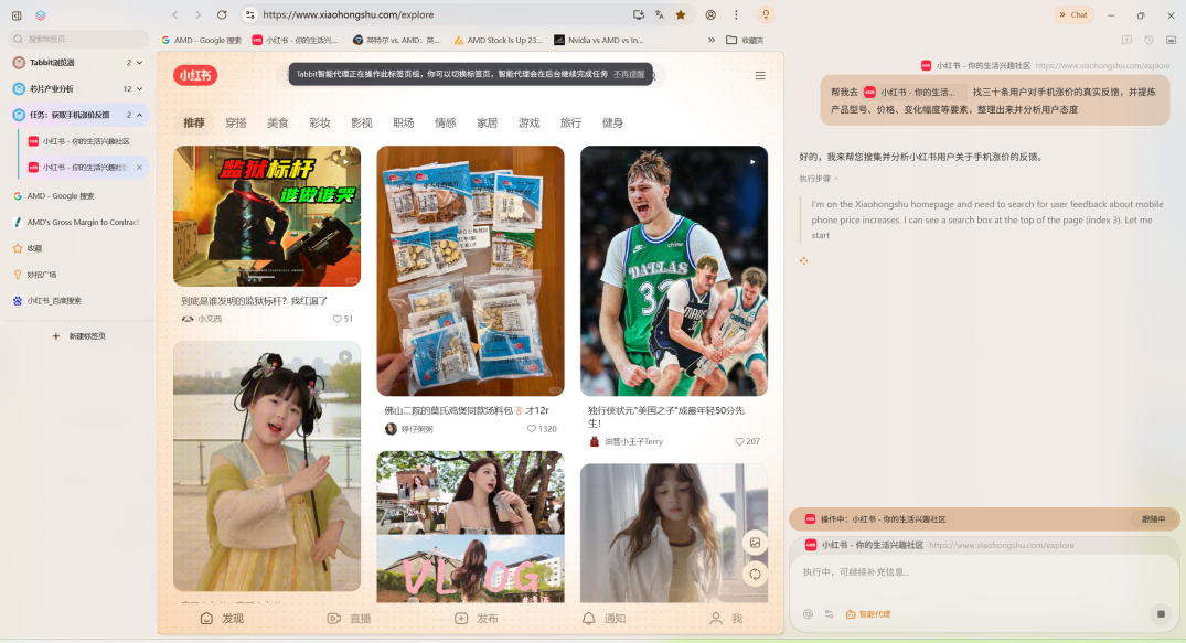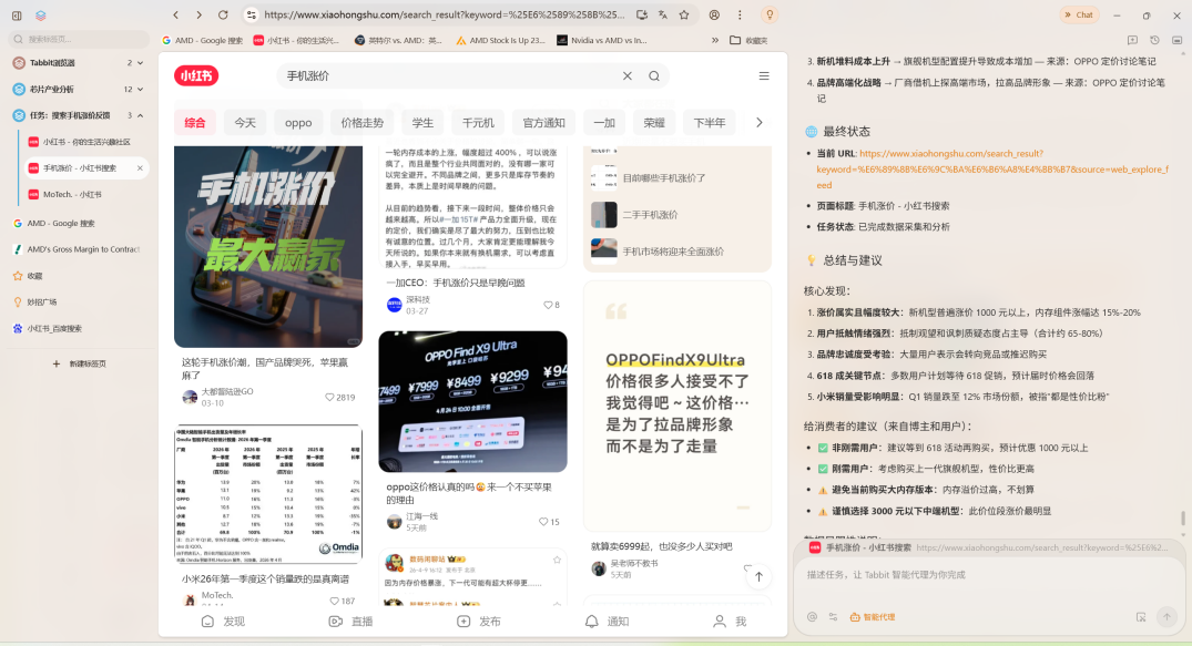 如果希望了解用户侧对手机涨价的反馈,就可以打开对话栏的智能代理功能,让 Tabbit 去社交媒体上帮忙找一找,现在的消费者如何看待手机涨价这件事。