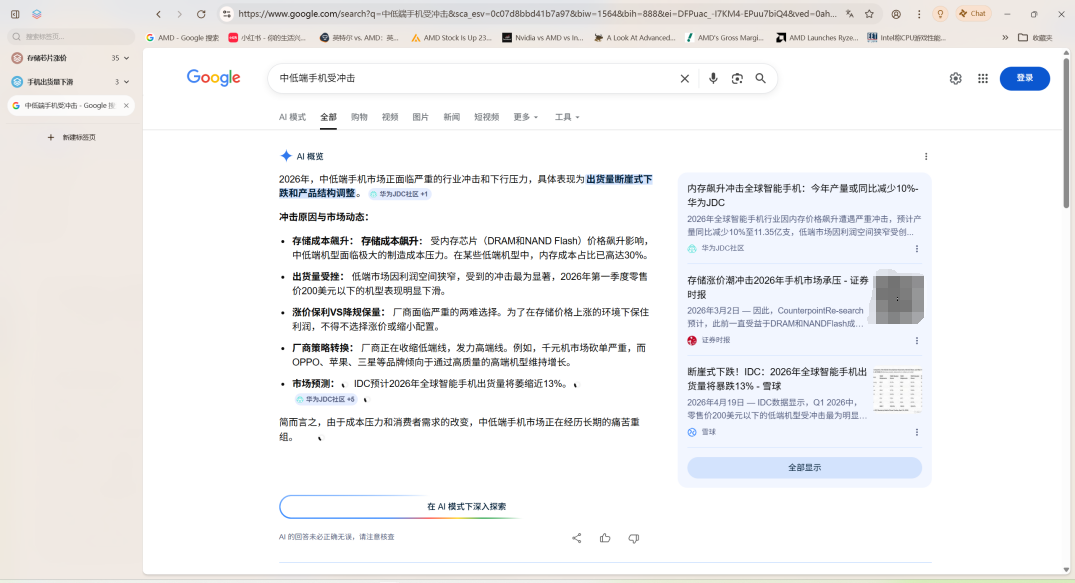 最后 AI 总结,这场存储芯片短缺可能持续至 2027 年末,并指出 AI 需求挤占电子产能是危机爆发的核心原因,手机行业面临产品策略与市场结构的重大调整。