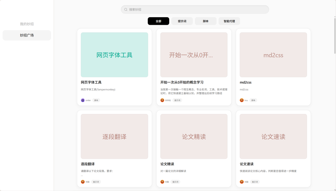 妙招功能则支持用户将常用的 AI 提示词、AI 指令保存为快捷指令,需要用时在对话中输入“/”就能立即唤起,无需重复输入,避免遗忘。平台的妙招广场则有全网用户生成的常用妙招,供你随时“抄袭”,简化工作。