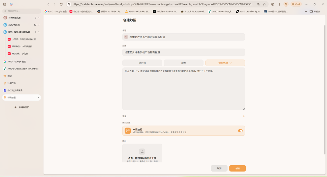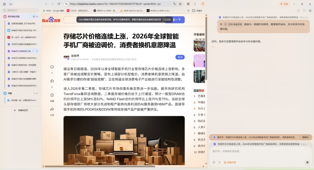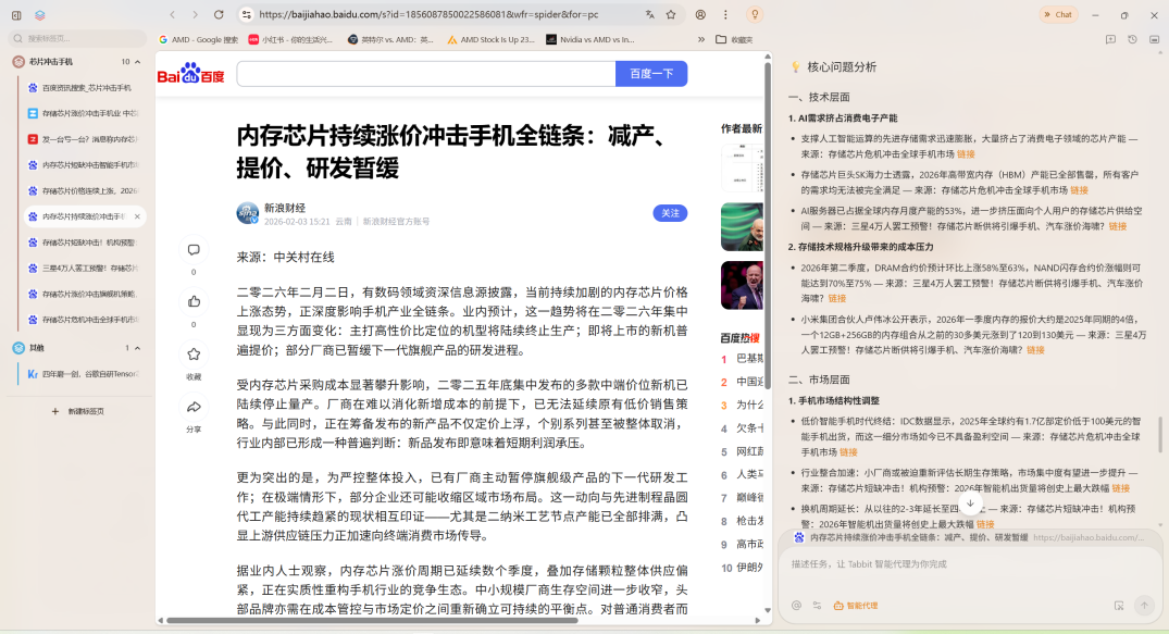 同时,我还可以要求 Tabbit 搜索存储芯片价格影响下游手机市场的最新报道,并打开十个页面。