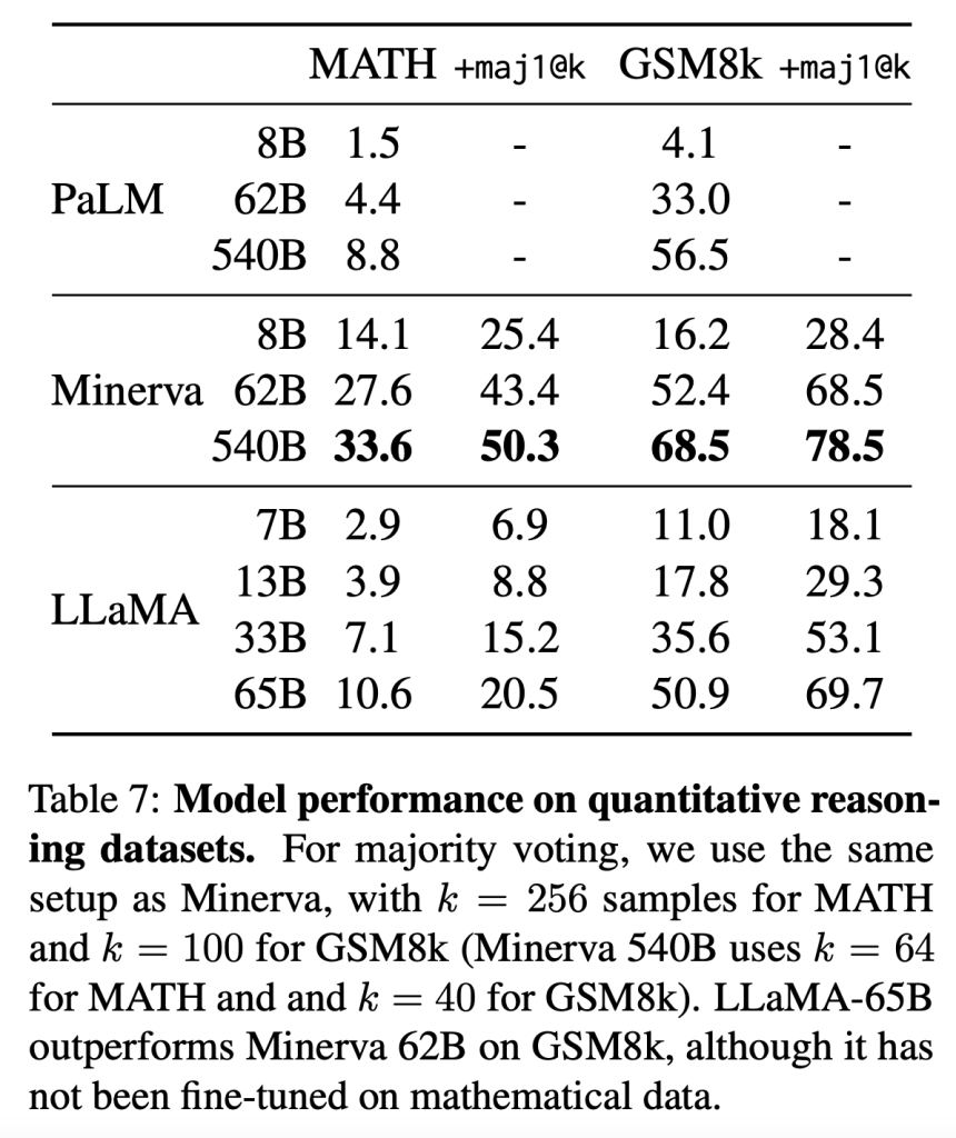 结果显示,在 GSM8k 上,拥有 650 亿参数的 LLaMA 优于拥有 620 亿参数的 Minerva。