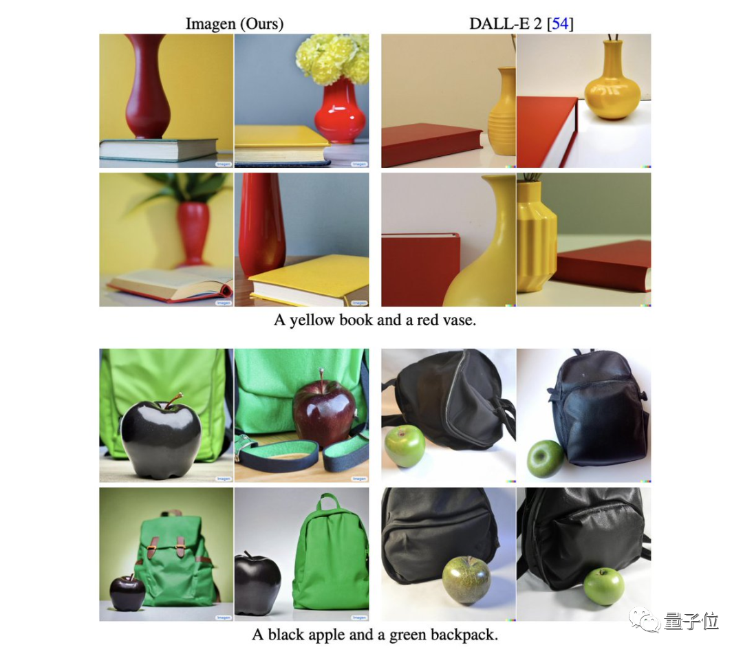 比起爆火的 DALLE-2,Imagen 能更准确地理解同时出现两个颜色要求的情况: