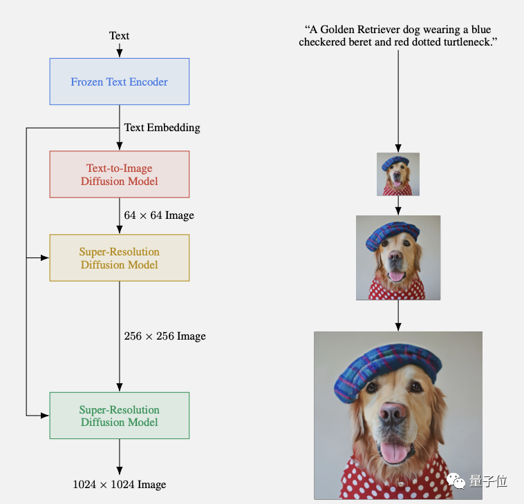 图像生成部分则用了一系列扩散模型,先生成低分辨率图像,再逐级超采样。