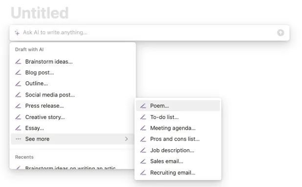 进入 Notion,当你新建一个文档或者长按空格键时,系统就会自动唤醒 AI 助手,并在下拉框为你提供了包括头脑风暴、博客撰写、提纲、社交媒体、论文、诗歌等十多类选项,几乎涵盖了打工人们与文字相关工作的方方面面。并且每一个选项都对应着不同的写作方式、模版和语调和拓展功能。