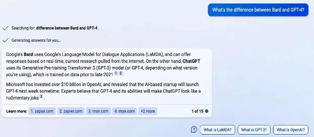 但在定位上,谷歌强调 Bard 并不是其搜索引擎的替代品,而是“搜索的补充”, Bard 自称为“你具有创造力的得力协作者(Collaborator)”,而 New Bing 则把 AI 助手称之为“副驾(Copilot)”。