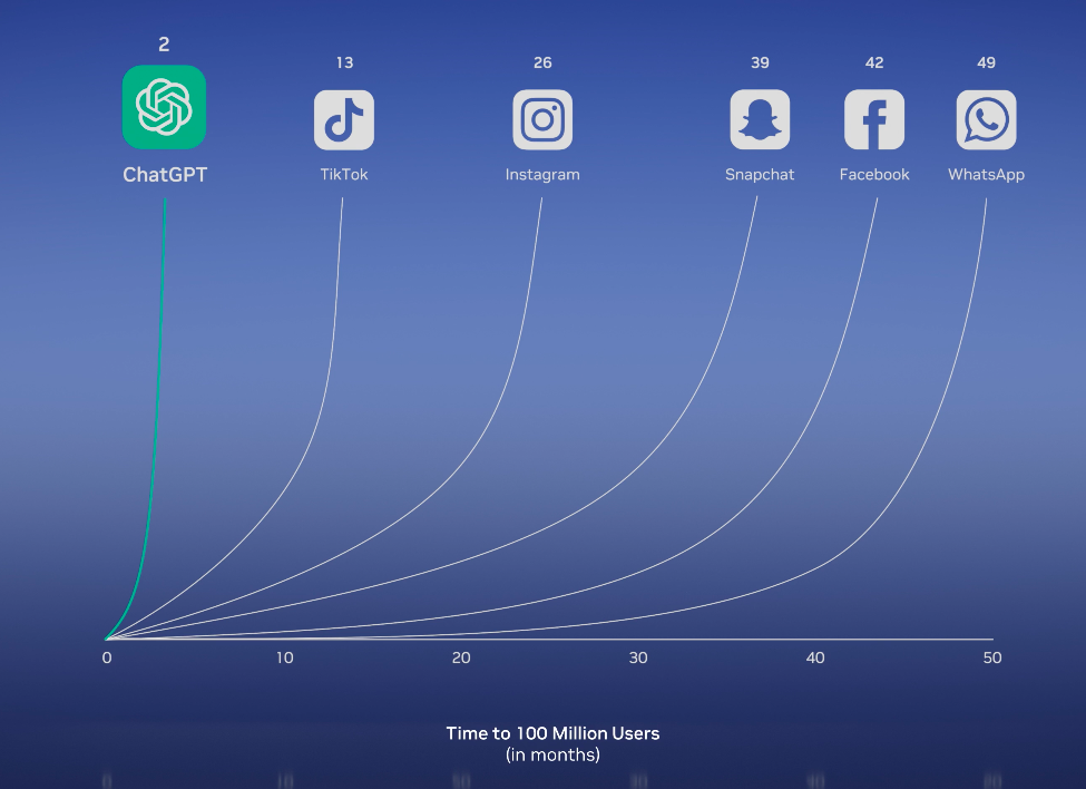 黄仁勋表示,ChatGPT、Stable Diffusion、DALL-E 和 Midjourney 唤醒了世界对生成式 AI 的认知,并两次提到这是“AI 的 iPhone 时刻”,ChatGPT 也是世界上增长最快的应用程序。