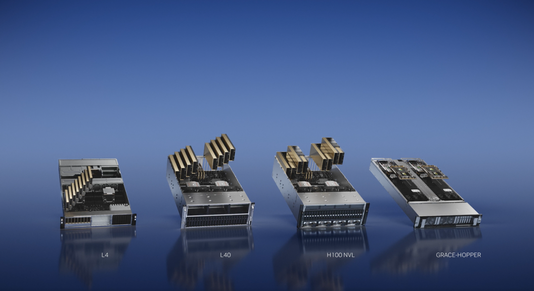 英伟达确实没有让观众失望,在不到 80 分钟的演讲中,黄仁勋发布了四款 AI 推理芯片,包括针对生成式 AI 图像处理、大模型处理的芯片;发布了三个大模型云服务,分别适用于文本、图像和生物研究;发布了超级计算机,以及针对场景优化的应用 100 个、更新功能的工业元宇宙 Omniverse。