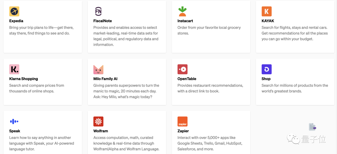 目前已支持的第三方插件,可以看到有餐厅推荐、旅行计划、购物、AI 语言老师、网上店铺,以及学术界知识应用 Wolfram、应用库(与 5000 多个应用程序交互,包括 Google 表格)……