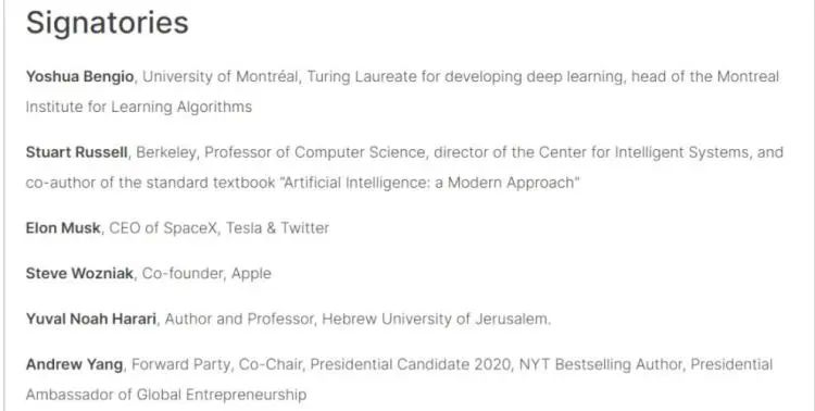 截至目前,这封公开信已经获得了 1125 个签名,其中不乏硅谷资本大佬或者是出色的计算机科学家。比如埃隆·马斯克、图灵奖得主 Yoshua Bengio、苹果联合创始人 Steve Wozniak、加州大学伯克利分校计算机科学专业教授 Stuart Russell 和《人类简史》的作者 Yuval Noah Harari 等人。