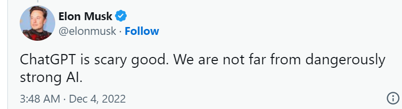 「ChatGPT 好得有点可怕了。我们距离危险的强人工智能不远了。」