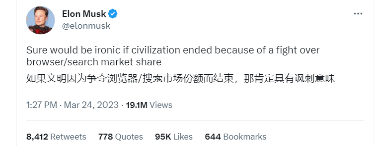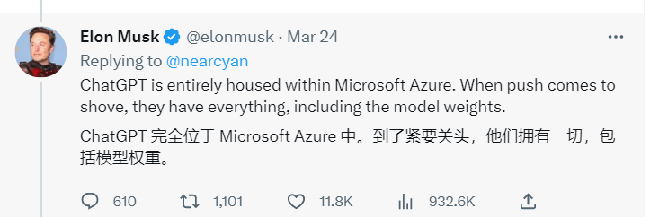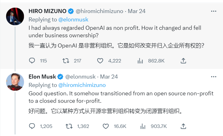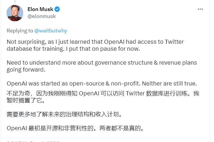 3 月 15 日,马斯克又批评 OpenAI 违背了其成为开源非营利组织以制衡谷歌的初衷。