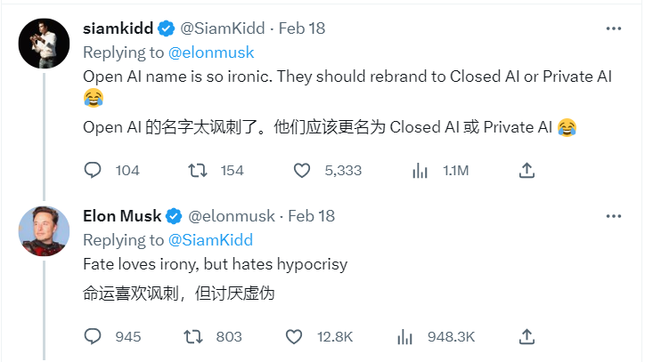 2 月 18 日,针对网友上传的与 GPT 有关审查政策的对话(GPT 表示遵守道德与语言使用相关政策,避免可能的攻击性冒犯性言论),马斯克和另一名网友讽刺的 OpenAI 的「open」属性。