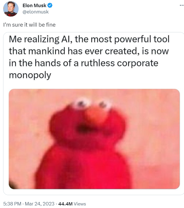 OpenAI 和微软都没有对马斯克的批评进行官方回应,3 月 30 日,他在推特上发了一条「我相信一切都会好起来的」和一个 Elmo 表情包,其中写道:「我意识到人工智能是人类创造的最强大的工具,现在掌握在无情的公司垄断手中。」