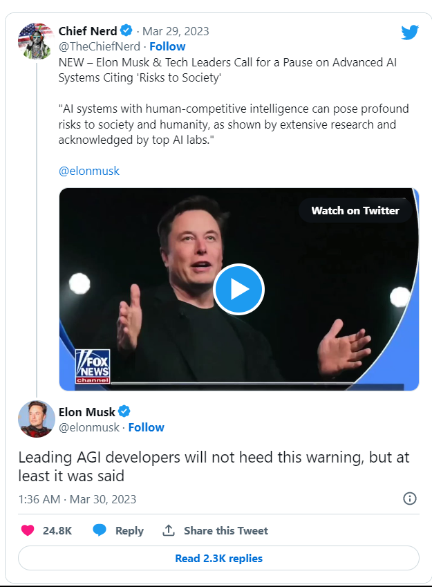 从这以后,作为推特老板的马斯克老师就开始占据「人工智能危险论」的舆论高台。