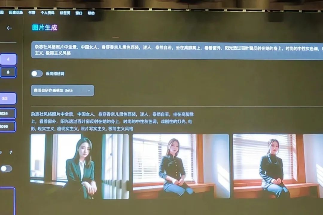 比如徐立现场演示了文生图平台“秒画 SenseMirage”,他先后输入了“站在窗边的中国女性”,“站在窗边的穿汉服的中国女性”等关键字,起初表现效果都很好,之后输入了“80 年代港风”作为关键字,但是生成的图片并没有显著的港风效果,这说明大模型对于该垂类风格的学习强度不及预期;但随后他将准备好的 20 张经典港风图片“投喂”给大模型,以商汤自研作画模型作为基模型来训练定制化 LoRA 模型,在几分钟后就生成了一个表达港风效果较好的 LoRA 模型。这种根据小批量样本快速适配新风格的学习能力也是商汤自研作画大模型的一个显著优点。