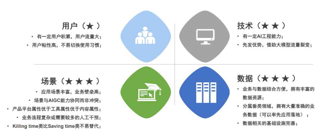 其三,技术成果总是在合适的经济节点上出现回报,但需要企业本身具备适宜的业务基础。国信证券 5 月 5 日发布研报指出,大模型技术变革条件下企业要更上一层楼,需要大致四个禀赋:“原有产品场景壁垒高,且受益于 AIGC 出色的信息获取、内容生成能力;有独特垂直的高质量数据;有用户粘性与深度;本身有较强的 AI 技术研发与落地能力。”
