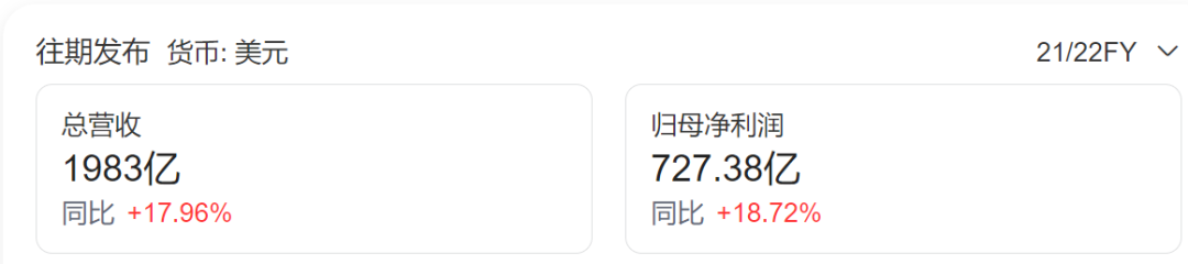 微软在涉足生成式 AI 之前业绩一直较为出色,财报显示,2022 年微软总营收 1983 亿美元,同比增长高达 17.96%,归母净利润为 727 亿美元,增幅同样高达 18.72%。近三年微软营收增幅分别为 13.65%、17.53% 和 17.96%,2022 年的营收增幅创近年来的新高。同期归母净利润方面分别为 12.85%、38.37% 和 18.72%,特别是归母净利润增幅 18.72% 虽然相比 2021 年有所下滑,但同样保持高增长趋势。