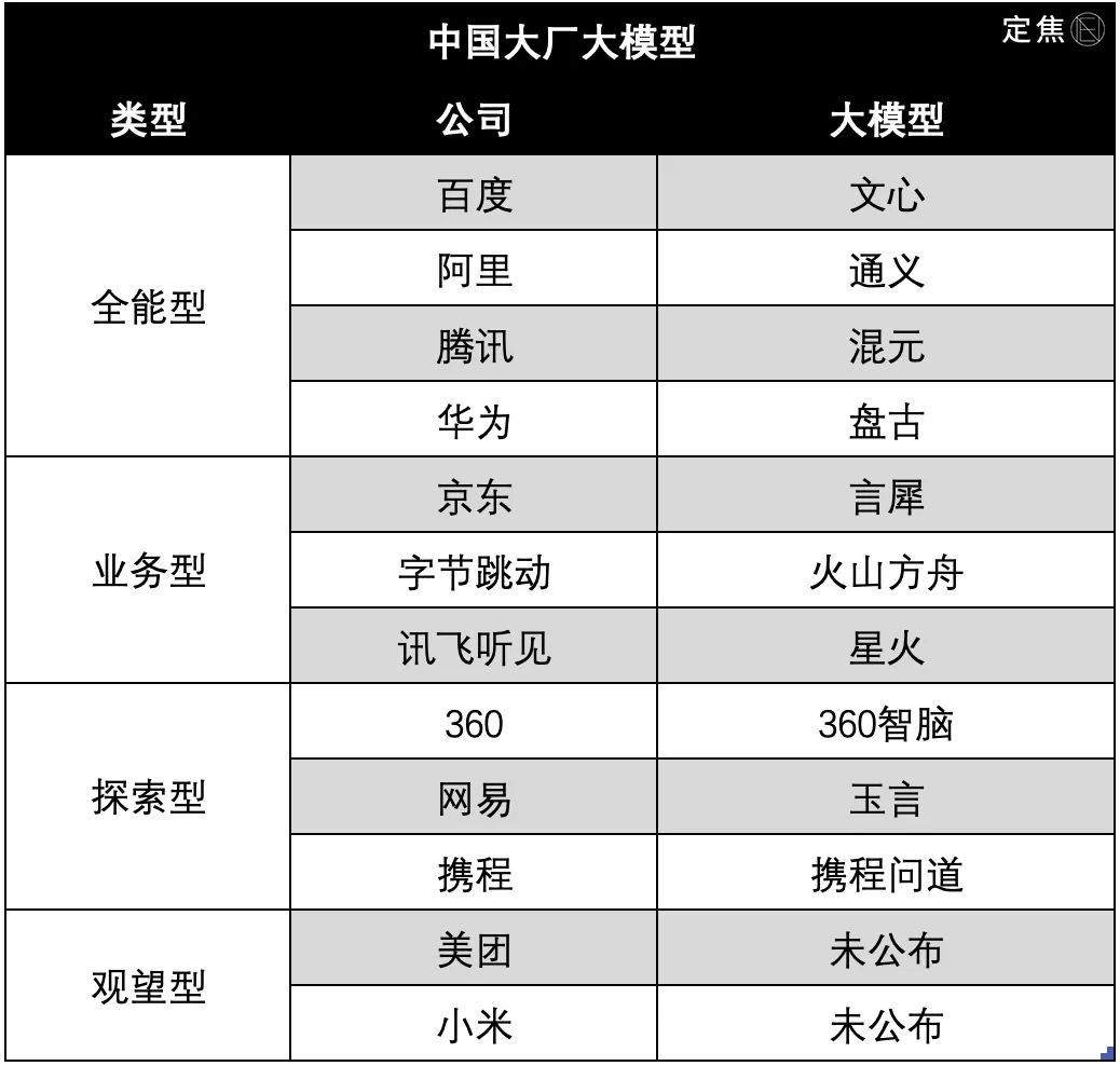 根据资源能力、布局深度、出招套路,大厂的大模型可以分为不同的流派。「定焦」将它们总结为四大类型:
