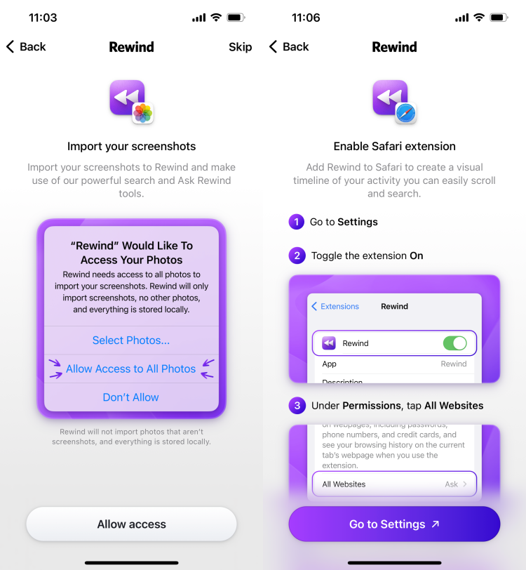 Rewind 目前在 App Store 的中国区商店也能下载到,进入 App 后,它首先会提示你需要开放 iPhone 的照片访问权限和 Safari 浏览记录的访问权限。