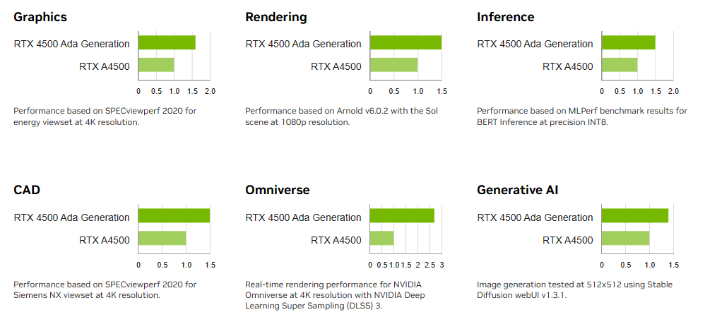 RTX 4500 配备了 24GB 显存,7680 个 CUDA 核心,240 个 Tensor 核心,60 个 RT 核心。