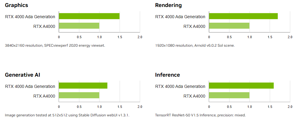 RTX 4000 配备了 20GB 显存,6144 个 CUDA 核心,192 个 Tensor 核心,48 个 RT 核心。