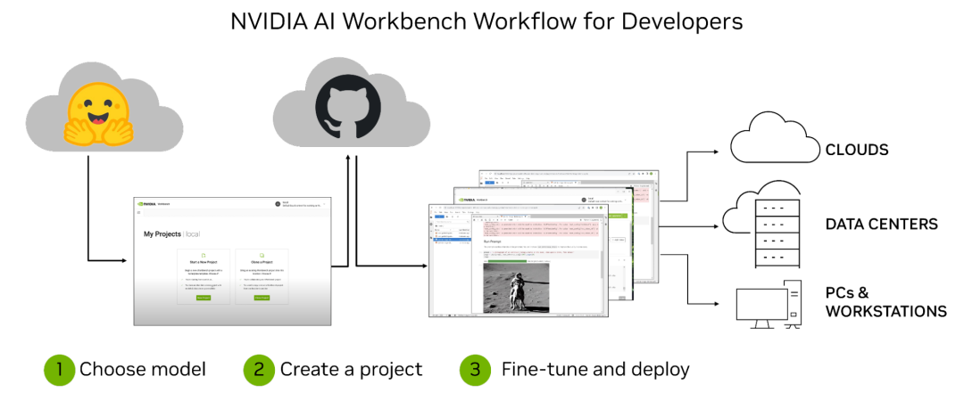 概括来说,AI Workbench 为开发者提供了一个统一且易于使用的工具包,能够快速在 PC 或工作站上创建、测试和微调模型,并无缝扩展到几乎任何数据中心、公有云或 NVIDIA DGX Cloud上。