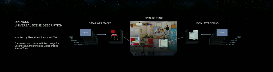 OpenUSD(Universal Scene Description)提供了一个开源,通用的场景描述格式,使不同品牌、不同类型的 3D 设计软件可以无障碍的协作。