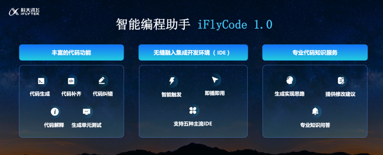 对于开发者来说,大模型的代码能力最终需要放在开发环境里才有意义。基于星火认知大模型 V2.0 的代码能力,讯飞星火发布了一款智能编程助手的应用级产品——iFlyCode1.0。