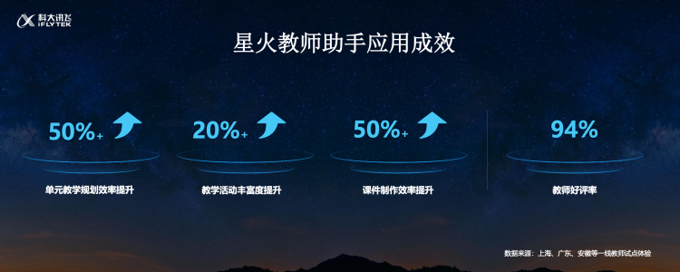 刘庆峰表示,在上海、广东、安徽等一线教师试点体验后,结果显示星火教师助手可以提升 50% 以上的单元教学规划和课件制作效率,教学活动丰富度也提升了 20% 以上。
